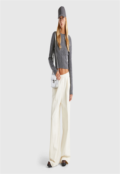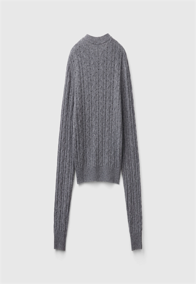 A long-sleeved sweater with a round neckline made from a soft wool blend. It has a short, fitted cut, with holes and ribbing throughout the piece. 80% wool, 20% nylon